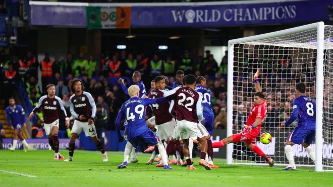 第37分钟,里斯·詹姆斯开出角球,维拉门前一片混乱,皮球砸在佩德罗的小腿上,弹进球门。