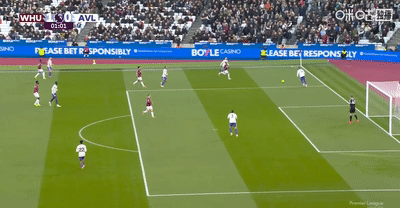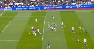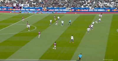 半场结束,西汉姆联暂时主场2-1领先阿斯顿维拉。